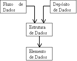 3. Fluxos de Dados e Depósitos de Dados: onde, fluxo de dados representa o caminho ao longo do qual as estruturas de dados viajam; e depósito de dados corresponde aos locais onde as estruturas de dados são armazenadas até serem requisitadas.